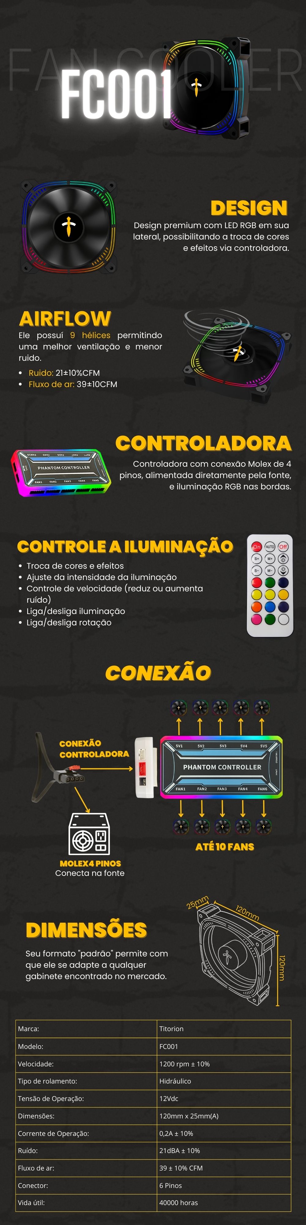 Kit Fan Cooler RGB Preto com Controladora